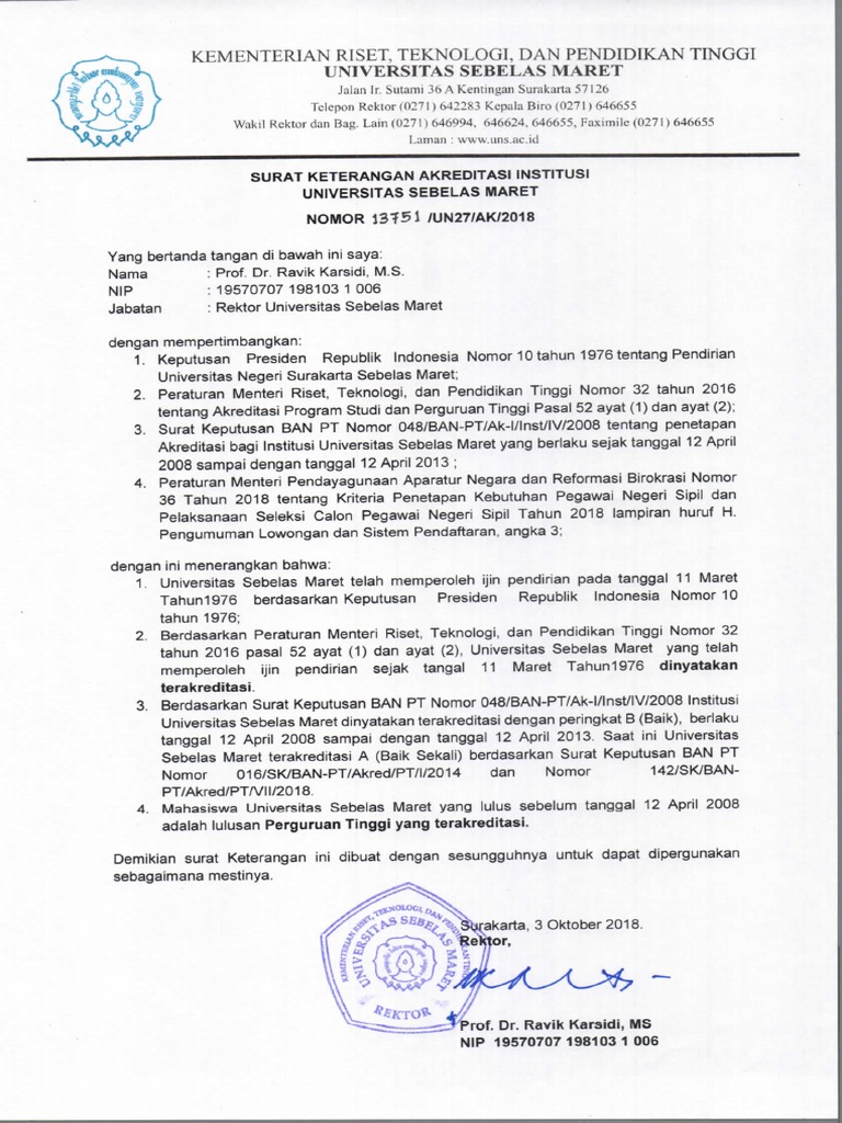 Akreditasi Uns Jurusan Compressed from imgv2-2-f.scribdassets.com Setiap siswa pastinya sudah memiliki kampus impian yang anda inginkan. Jawaban pertanyaan ini adalah akreditasi a dan 225 kursi. The alliance on business education and scholarship for tommorow, a 21st century organization (abest 21). Get complete details of masters programs offered by universitas sebelas maret including how it performs in qs rankings, the cost of tuition and further course information. Contact details of universitas sebelas maret surakarta. It is colloquially known as uns or uns solo) is an indonesian public university in the suburban area of surakarta, central java, indonesia. Ukt universitas sebelas maret (uns) dalam perkembangannya mengalami perubahan dari tahun ke tahun. Universitas sebelas maret surakarta merupakan salah satu ptn dengan peminat yang cukup banyak.